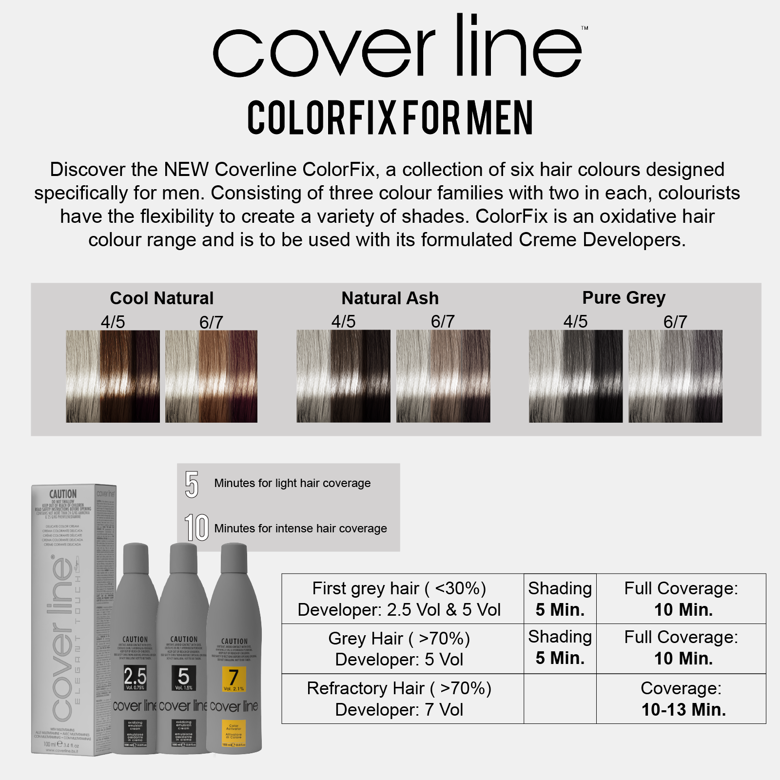Discover the NEW Coverline ColorFix, a collection of six hair colours designed specifically for men. Consisting of three colour families with two in each, colourists have the flexibility to create a variety of shades. Choose from Cool Natural, Natural ash and Pure grey.